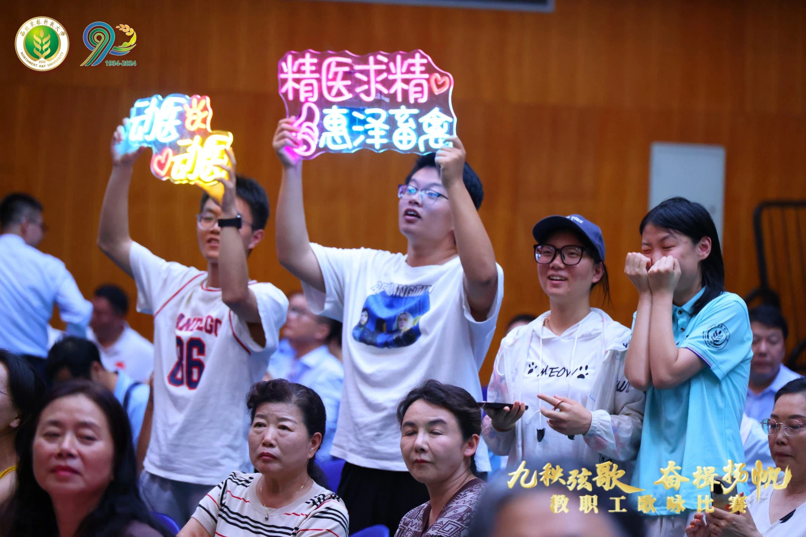 在这充满热情的观众中,有一群特别的存在——我们动医的同学们。他们举着自制的应援牌,脸上洋溢着骄傲的笑容。当老师们的身影出现在舞台上时,学生们的掌声尤为响亮。