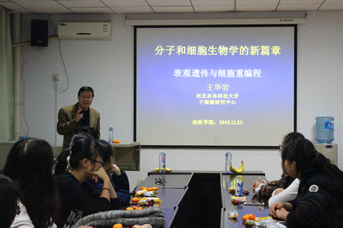 王华岩教授任我校动物医学院教授,担任博士生导师,在生物科研方面取得了多项成就。有着渊博的学识和丰富的教学经验。活动在同学们的热烈掌声中拉开帷幕。教授给我们带来了一场题为《分子和细胞生物学的新篇章》的报告,主要围绕表观遗传、细胞重编程、IPS技术等三方面普及了相关知识,让我们提前感受科学,而且结合具体事例为我们做出了深入浅出的讲解。期间,教授列举韩国黄禹锡学术造假事例教育我们对待科学要持以严谨认真的态度,热爱科学、尊重科学。随后,大家展开积极的讨论,就专业方面的疑惑进行提问,教授耐心地给出具体中肯的意见,讲座氛围一时达到热潮。