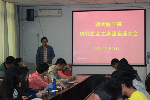 经过个人申请、班级推荐产生了 8名候选人。通过研究生QQ群、飞信、微信公众平台“西农动医”等方式对8位候选人的基本情况和竞选宣言进行了宣传。经过为期三天的宣传,10月19日,在学院二层会议室进行了公开竞选投票。8名候选人对个人简介、竞选宣言、工作设想等展开了演讲。辅导员、上一届研究生会成员、研究生代表参与了投票选举。投票结束后,工作人员进行了计票,并对最终选举结果进行公示。