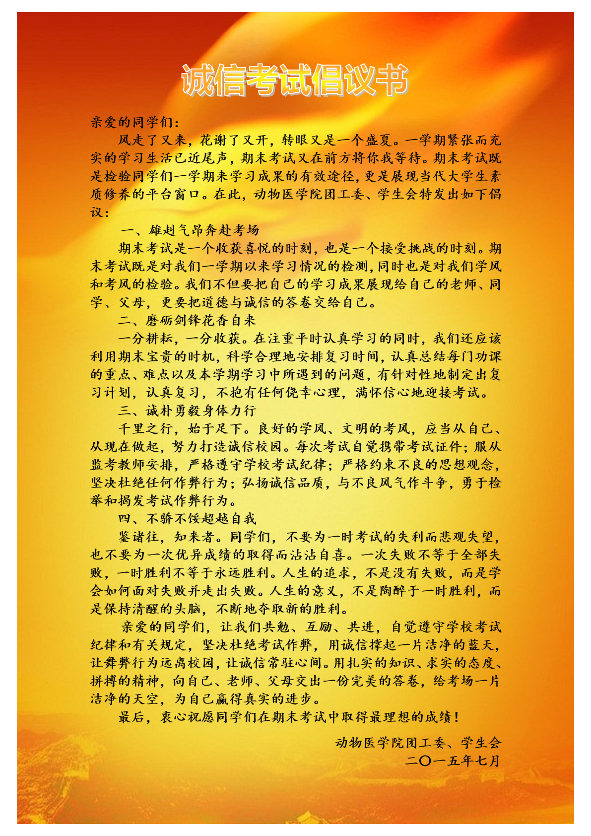 积极利用新媒体,倡议诚信应试。积极利用学院西农动医微信公众平台发布“诚信考试倡议书”及《大学生手册》中违纪与作弊行为的认定与处理条例。倡议同学们自觉遵守学校考试纪律和有关规定,坚决杜绝考试作弊,用扎实的知识,求实的态度,拼搏的精神,向自己、老师、父母交出一份完美的答卷。