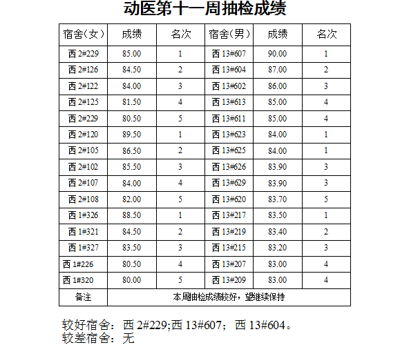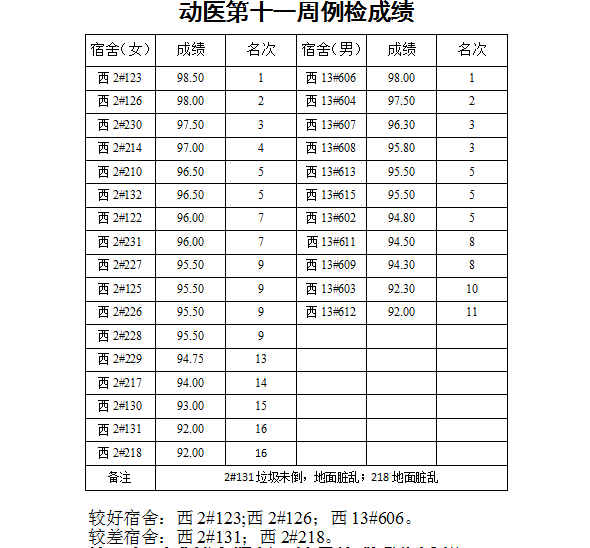 【生活部】动医学院第11周宿舍卫生成绩公示