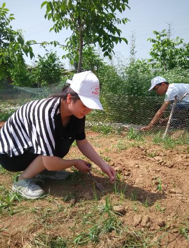 一方小小的菜园被利用的非常合理,两行玉米苗,两小块蒜苗,一块萝卜,一块芹菜,甚至连四周的田埂上都种满了鲜红欲滴的草莓,不得不感叹劳动人民的心灵手巧。对于我们三个人来说,两个学动医的,一个学植保的,不管是现在的学习还是未来可能面对工作,像这样站在田间地头,站在科学研究的第一线肯定是必须的。所以“田园使者”实践服务任务,不仅仅是服务农民,更是锻炼自己一个好的途径。而拥有一颗勇于奉献的心,美过世间万物。