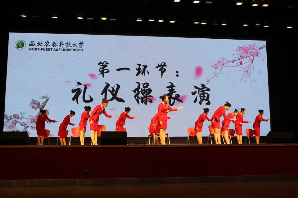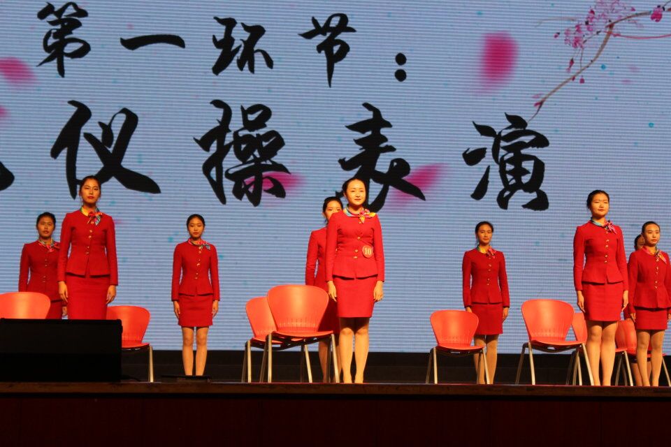 为了将最佳的状态呈现在大家的面前,队员们争分夺秒,早早来到化妆间进行妆容整理以及服装准备,即使是其他院系上台表演的时间,女孩子们也在后台进行着最后一次礼仪操的排练。站姿、坐姿、蹲姿,从女孩们激动中透着些许紧张的脸上可以看出,每一个细微的动作背后都有她们夜以继日的辛苦训练。终于,舞台上聚光灯亮起,女孩们的脸上洋溢着自信灿烂的笑容,伴随着悦耳的音乐声,她们用一段简洁大气的礼仪操为我们完美的展现出了中华礼仪的风范。
