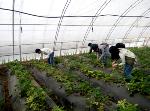 抵达目的地后,使者们便跟随工作人员来到了草莓棚。工作人员给热心的使者们布置了一个小任务――拔草,并耐心讲解拔草和揪草莓茎的妙招。听完讲解之后,队员们在队长的分配下,有条不紊的开展自己的拔草之旅。不到2个小时,各队员的手上和鞋上便沾满了泥巴,虽然如此,队员的心中却是十分快乐的。拔草途中虽有错误出现,但也正是这些错误让队员们学到更多知识。回首成果,田园使者们的脸上都洋溢出满足的笑容,劳动最光荣!