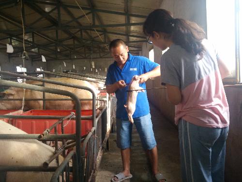 上午七点半,队员们跟随猪场技术员学习了如何辨别新生仔猪是否患常见病和患病仔猪的治疗。技术员一边工作一边指导队员们如何根据仔猪的表现判断仔猪是否患腹泻、喘气病等常见病,然后教队员们如何使用合适的药物来治疗疾病。队员们一边认真观看学习、提出疑问,一边积极帮助技术员完成当天的工作任务。